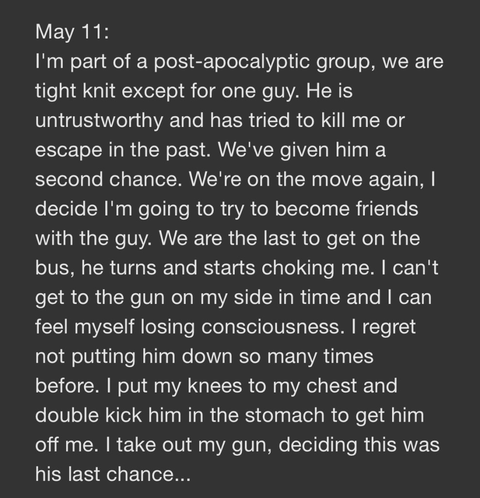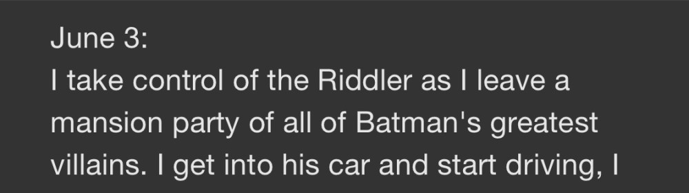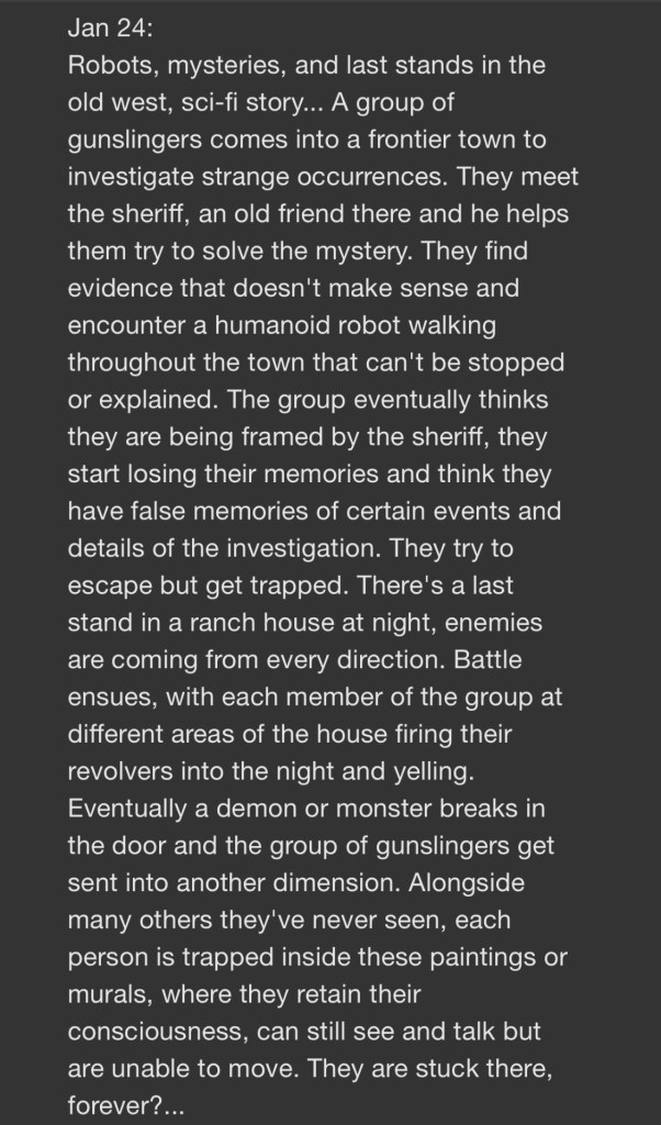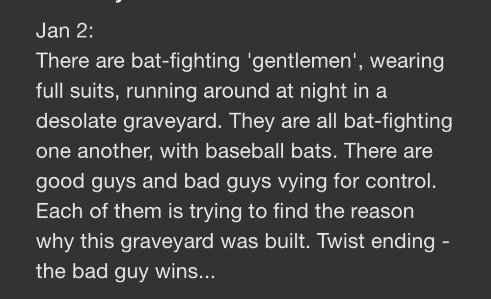 I am not someone who necessarily believes there is significant meaning within dreams, in a spiritual or subconscious sense. I do believe there can be meaning, of some kind, but it’s mostly due to interpretation. It’s certainly entertaining, and maybe even illuminating, to chronicle your dreams. My dreams are quite variable — ranging from the run of the mill embarrassing social misadventures, to crossover superheroics with real and fictional friends, to absurdly singular interactions which would otherwise be mundane if not for some distinct out of place element. Over time, one will begin to see similarities in the personalized motifs and structures of one’s dreams.