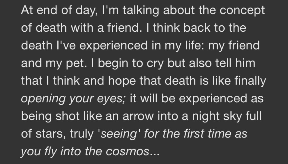 This is fascinating to me. Because there are so many moments and scenes in the reality of my waking life which I cannot remember so well. Many of these old dreams remain in my mind, clear and meaningful in my remembrance alone. They are evoked simply from short, sometimes long — sometimes multiple dream instances recalled at once — contemporaneously recorded descriptions within notes. I can read them and draw these images forth at will. In these ways, journaling provides a natural and exacting feat of memory.