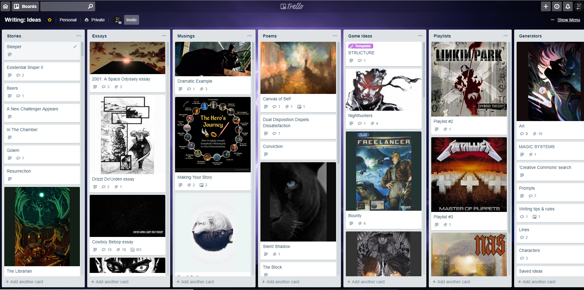 By the very same notion, my Trello board of writing ideas of all kinds became a recursive form of motivation for me to execute my newfound writing habit — my own work. From this whimsical Twilight Zone brainstorm extravaganza, I had created a canvas for me to return to, again and again, as I naturally began to produce new ideas for writing. I knew from the start I would be interested in many different formats for my writing, outside of just fiction. So they came in the form of short stories, essays, musings, poems, game concepts — all categorized and contextualized into a sensible format within the pillars of Trello’s code.