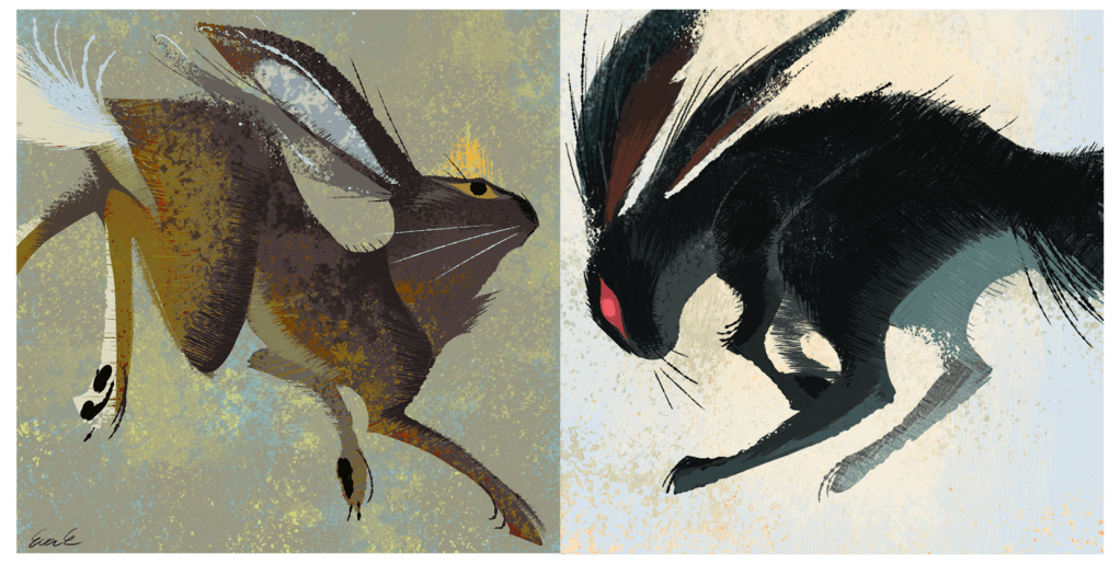 Elil, “The Thousand,” are their many predators. Always out there, an unseen foe, they are on the hunt. At least, they are in the minds of their prey. A rabbit must continuously be aware of the threat of being devoured by the world around it, and The Thousand, waiting within the darkness of the unknown are the agents of that haunting presence. In the world of the rabbit, night is called ‘Owl Time.’