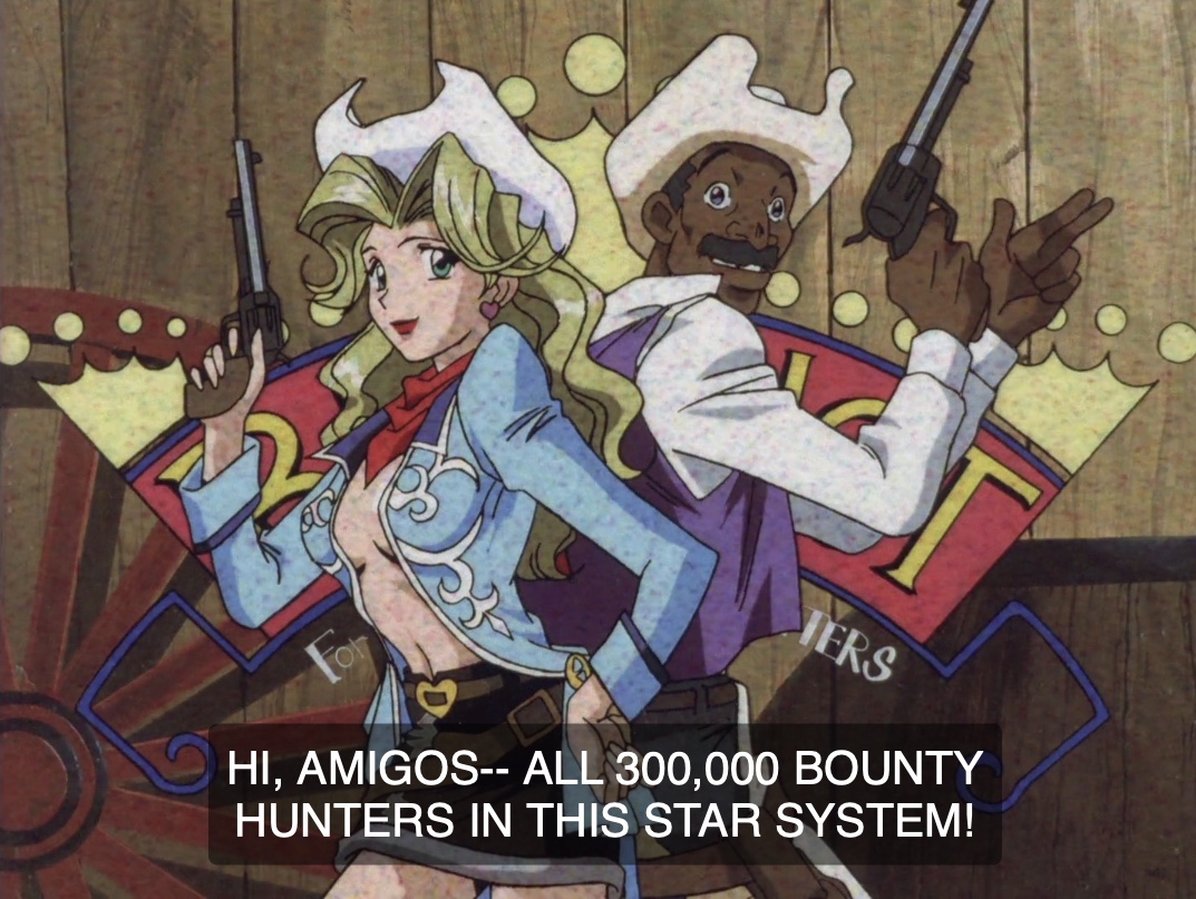 In the realm of the show’s world, nothing better represents the endless hustle of individualism and freelancing entrepreneurship so commonplace in our increasingly Westernized modern world, than that of the bounty hunter. As humanity spreads itself among the cosmos using cutting edge warp gate technology, growth slows and the hard work of colonizing new planets begins, a new industry emerges — the hunting of troublesome people via bounties. I speak of ‘crooks’ but in truth nothing prevents wealthy patrons from simply placing bounties upon parties they want retrieved or eliminated, their quarrel with the law untraversed, just like in the Wild West days of yore. The purveyors of the bounties make a game of it, complete with leaderboards and intricate parameters for the jobs and a funky, funny game show-esque program dedicated to informing hunters of the best game in town.
