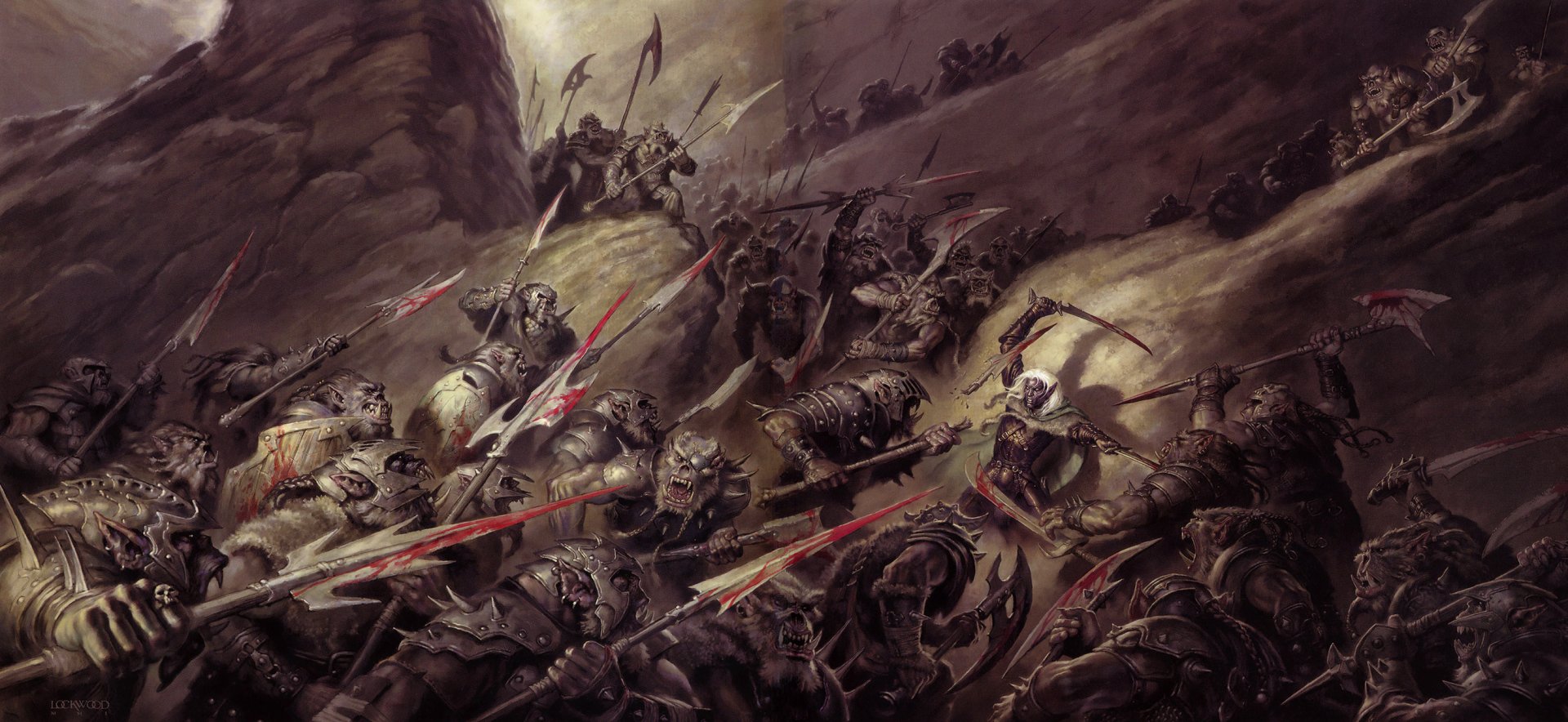 Along this same track, there is a particularly striking tale of Drizzt’s encounter with a goblin named Nojheim {in an anthology series titled Realms of Valor}. In it, through a brief but enlightening interaction with the “goodly” goblin, Drizzt is apprised of the possibility of goblins to break through their dark heritage as evil beings. With both goblin and orc, Drizzt perhaps transfers his hopes of the path of his own people onto them, and his considerations deviate from all the previous years of his life. What if orcs and goblins, and even dark elves, can be good? This particular experience with Nojheim ends tragically, but his worldview and his natural prejudice against the beings of goblins shifts. It is this encounter among others with the orcs, that comes to shape his future decisions of micro and macro violence against these beings. He is forever changed by these encounters, and actively refers to them in all future courses of action, among companions and in his journaling.