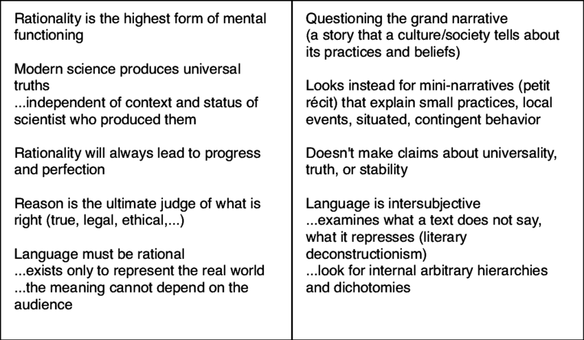 In short, it is a challenge to or skepticism of objective reality and truth, and of the possibility of grand, interconnecting narratives existing within humanity’s course as a species. It is a countering belief, or philosophical response, to modernism.