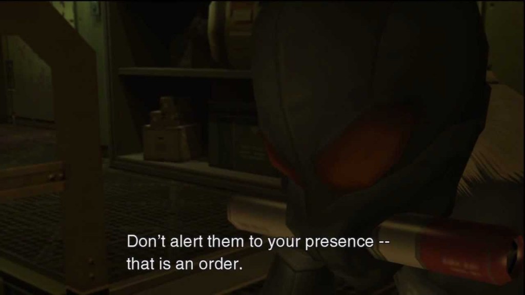 What follows is a kind of ascended re-run of the arc of Metal Gear Solid, with the names and faces of the players involved, the locales and equipment in play, and the protagonist himself — swapped out for different, albeit similar, entities. Once again, our existentially skeptical supersoldier infiltrator is progressing through a steel complex full of traps and goons, with the occasional enhanced, eccentric individual to take down in a dramatic 1v1 showdown (including a glammed up goth vampire, a rollerblading fatman bomber, and an anti-heroic cyborg ninja {again}).