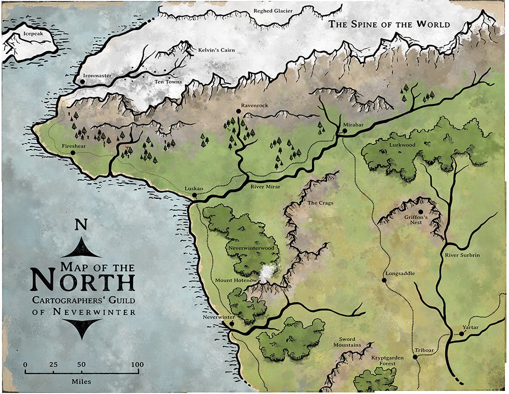 Start your journey in ~ Icewind Dale / Kelvin’s Cairn ~ “The snow-capped peak of Kelvin’s Cairn rises alone above the frozen tundra, the only mountain in a thousand square miles. Because it appears to be a loose collection of boulders piled into a rough pyramid, barbarian legends call it a grave marker, though most likely it is an extinct volcano. Verbeegs make their dens on its rocky slopes, the dwarves of Clan Battlehammer mien a river valley along its south face, and Drizzt Do’urden found a secluded home in a deep cave on its lonely north face.”