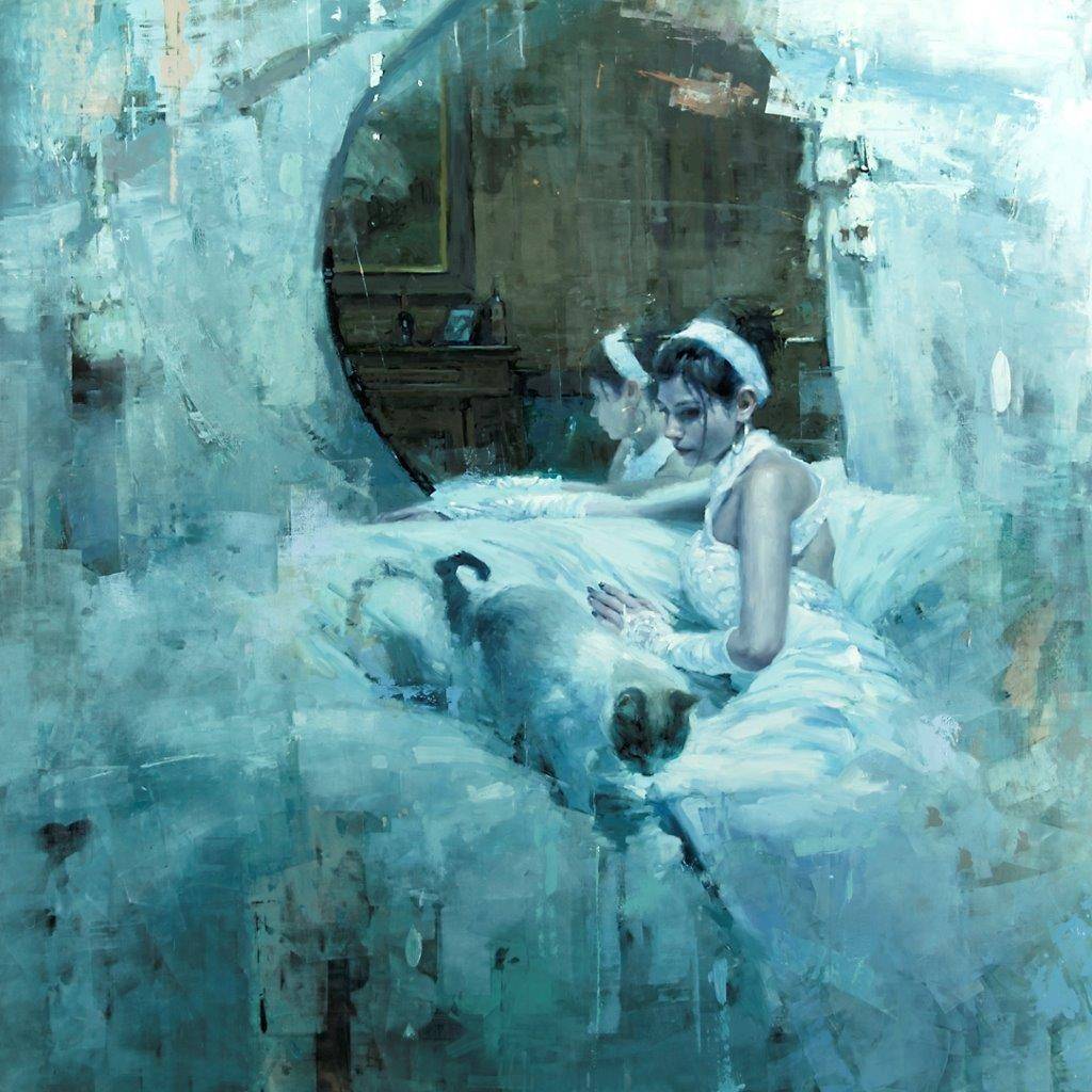Beau worked hard to calm herself, flexing her calloused fingers and counting her breaths. “No,” she finally said, and walked determinedly to the other side of the gallery. On the opposite wall, directly across from the daemonic shapeshifting portrait, she found a different style and a new scene. Another young woman, in a sparkling white dress, posed morose and away from a mirror she sat up against. Her arm, sleeved within a tendril of the strange dress she wore, lay upon a cushion at neck height. Assured in comfort, where the daemon-facer was uncertain, this woman was assured in her comforts. Her gaze fell to the floor, contented, or maybe even bored. Just below her, upon the same couch, a grey cat prepared to pounce onto the ground. Both of the denizens within the scene held their eyes fixed to something below. Beau diverted her attention below, too. Below the painting, imagining what it was that they might be looking at. She first imagined the body of a man down there. It having such a distinct impression upon her, she could not just then imagine anything else. So it was.