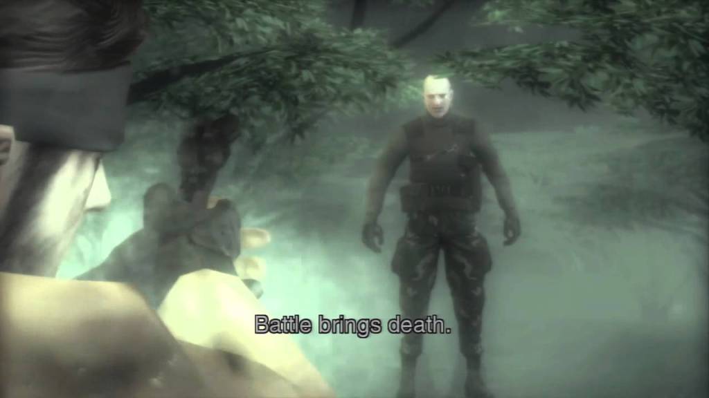 One aspect of MGS3 that I was disappointed with midway through my experience was the lack of existential ramblings and philosophically compelling backstory dumps from our rogues’ gallery of fallen sub-bosses. Most of the Cobras die without much to say in the way of their lives and their regrets; their legacies are as appendages of The Boss, and as intriguing fights for Snake to encounter and solve. The End, the old, bearded sniper — who like a Disney princess has become one with nature and uses snakes, insects and birds as spotters for his deadly art — has the most memorable death sequence of any. Such self-delivered epilogues as mid-mission melodramas for Snake and the player to experience, delivered best in MGS1, has definitely been one of my favorite things about the games.