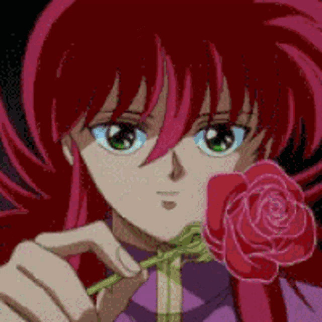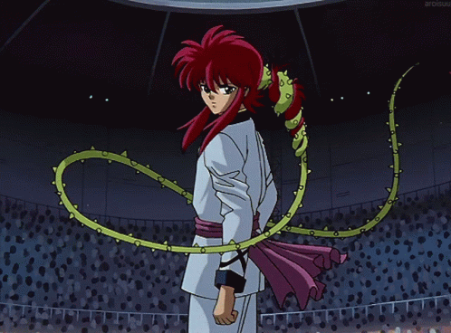 Kurama {my favorite character in the series} represents in part the capacity for profound grace and beauty within one of demonkind. A pretty boy master strategist who uses a rose whip as his primary tool within combat, Kurama wins with indirect means, often through cunning or bloodless misdirection, generally with a dose of poeticism to the endeavor. Kurama at heart is a kind being, with a more humane moral code than most of his brethren, carrying a healthy appreciation of the beauteous nature of the world, in the light and in the dark.