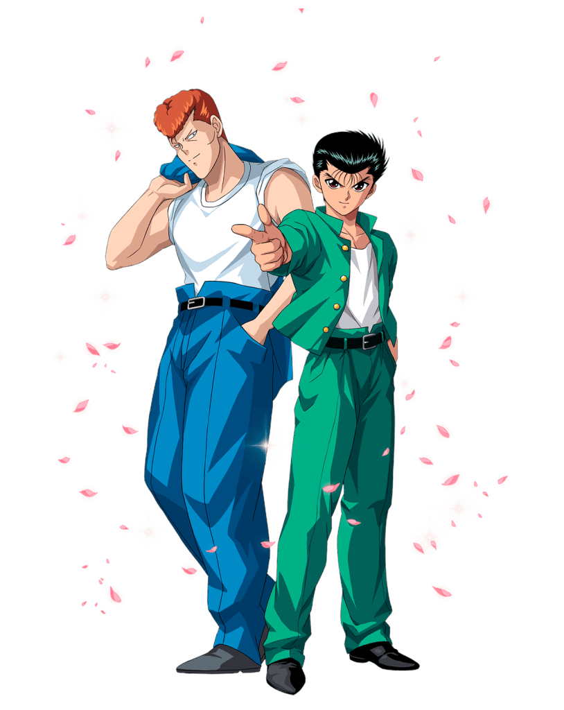 Yusuke and Kuwabara’s relationship is the original spark, and the most endearing. Yusuke is the existentially-minded bad boy with a secret soft side. It is his selfless act to save a child from getting hit by a car, trading places with him in the heat of the moment, which kicks off the adventure. Kuwabara — the ultimate anime manifestation of a “himbo” — is the striving ruffian under Yusuke’s shadow, peerlessly resolved to pick fights with him out of a barely hidden desire to befriend him.