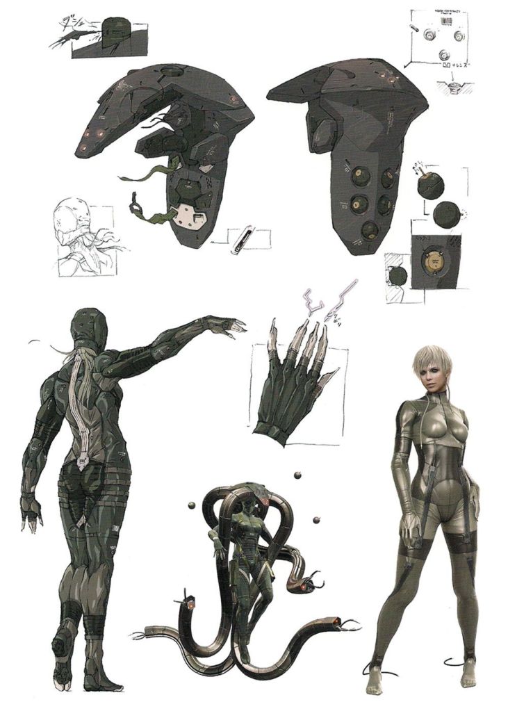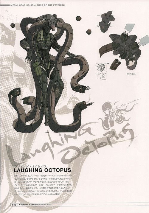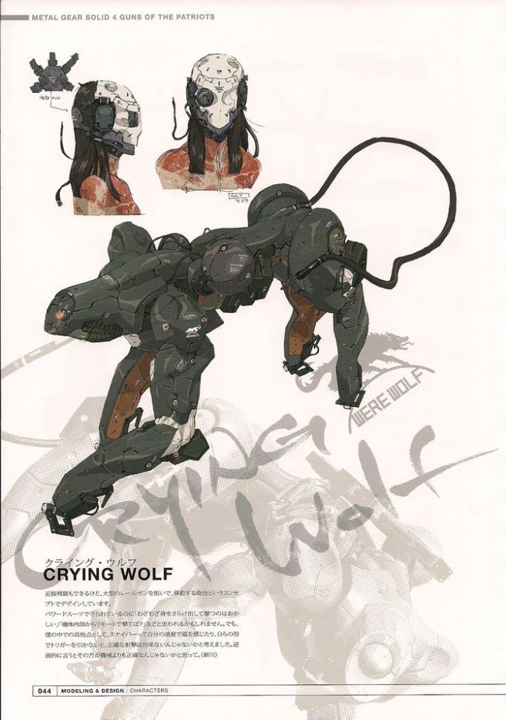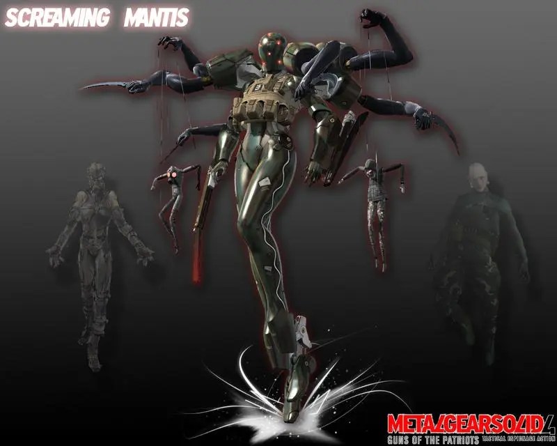 Strangely enough, MGS4’s gallery of rogues ~ the B&B Corps ~ are perfectly harsh amalgamations of Metal Gear’s manifold themes and aesthetics — {and boss fight ingenuity} — including and especially such soldierly dehumanization. The “Beauty and the Beast Unit” are a quatro of supersoldier babes that Old Snake must fight over his journey toward Liquid ~ Laughing Octopus | Raging Raven | Crying Wolf | Screaming Mantis.