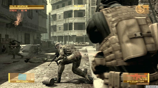 Early on in the narrative of MGS4, “Old Snake” — Solid Snake cursed with accelerated aging from his cloned genes and the FOXDIE virus — meets a merchant upon the battlefield. Sent into the Middle East to find and kill Liquid Ocelot, the brilliant, unholy polymerization of Liquid Snake and Revolver Ocelot now weaving a new nefarious plot, Snake comes across Drebin, a sly weapons dealer who speaks to him of the “war economy.” He becomes an ally throughout your adventure, mostly for business purposes — as he is the one who you can sell your on-site procurements to and buy your bullets and unlocked weaponry right back from, the personal locus of MGS4’s primary new feature: an in-game, real-time equipment shop.