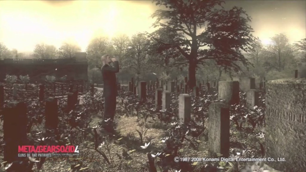 A final dichotomy in the nature of one’s aging, and the violence or nobleness of their life and death, can be seen in MGS4’s beautifully affecting final cutscene between Old Snake and Big Boss in the cemetery.