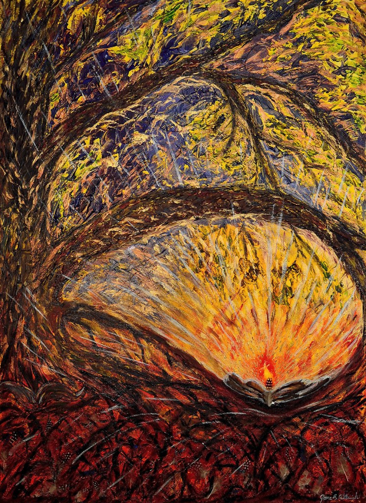 As Olly’s thoughts flashed by, as far as she could scan the horizons the fires of the entire forest burned higher and higher into the dusky sky — she finally realized that the fire did not harm her. It could not. The heat was there, the flames tore over her body… But there was no pain. No burns. They did not catch upon her, even as the flames bathed her entire form in their light and rage. She burned but did not die…