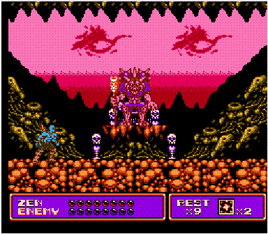 Mutated ninja monsters! ~ In an even more devastating turn for protagonist Zen, much of Contaminous’ extra-dimensional army is drawn from other zones of the universe, from his battles and mental dominions over Zen’s colleagues in the intergalactic ninja corps. Thusly on Earth, Zen will be crossing his Pho against former ninja, now brainwashed full of mental toxins by Contaminous, or fully transformed into demonic and monstrous enemies. Along with Zen’s own moral code and stance against killing, Zen is also ultimately evasive or non-lethal in his combat strategy for this reason – he does not wish to seriously harm his former brethren.