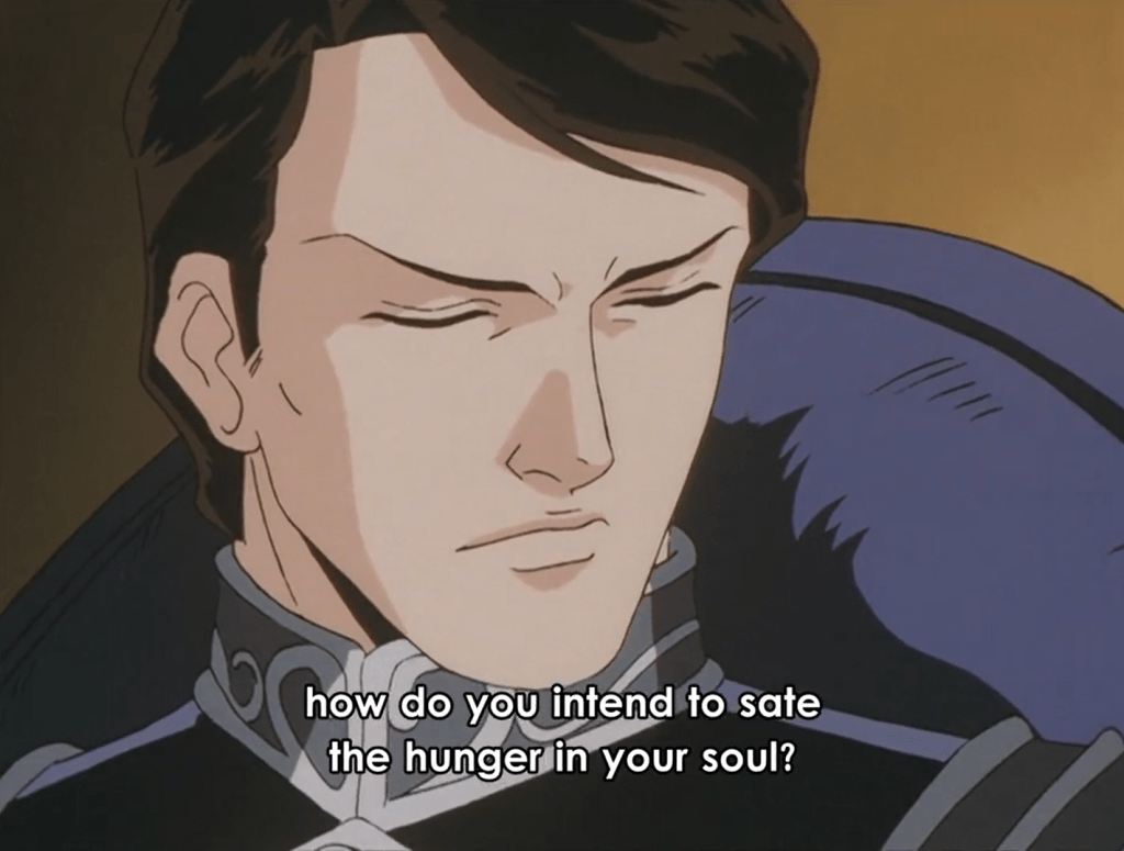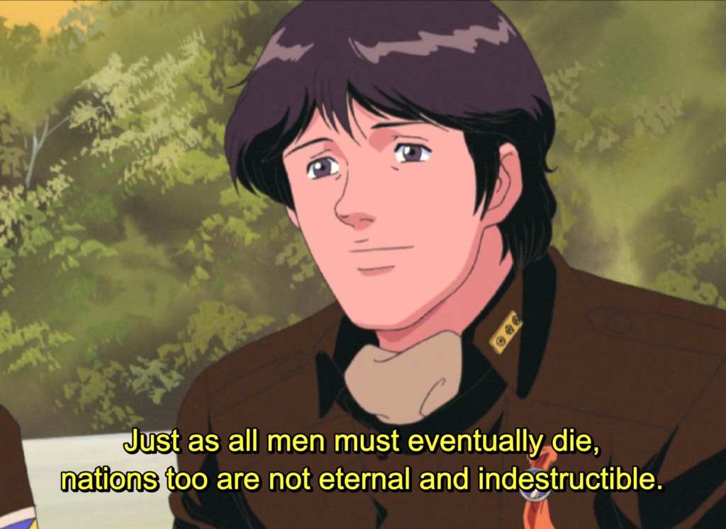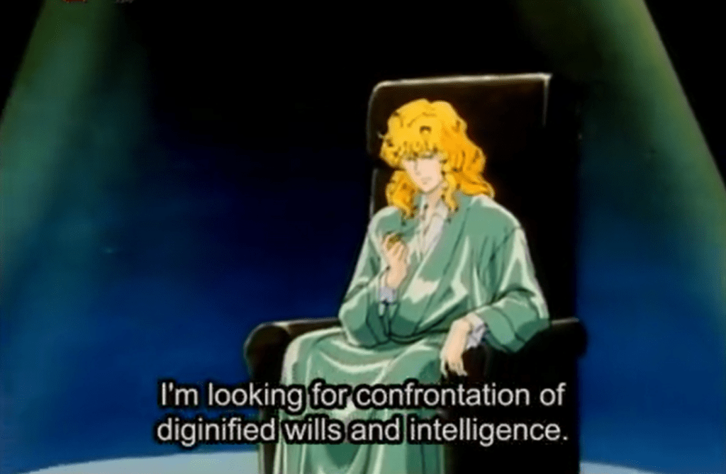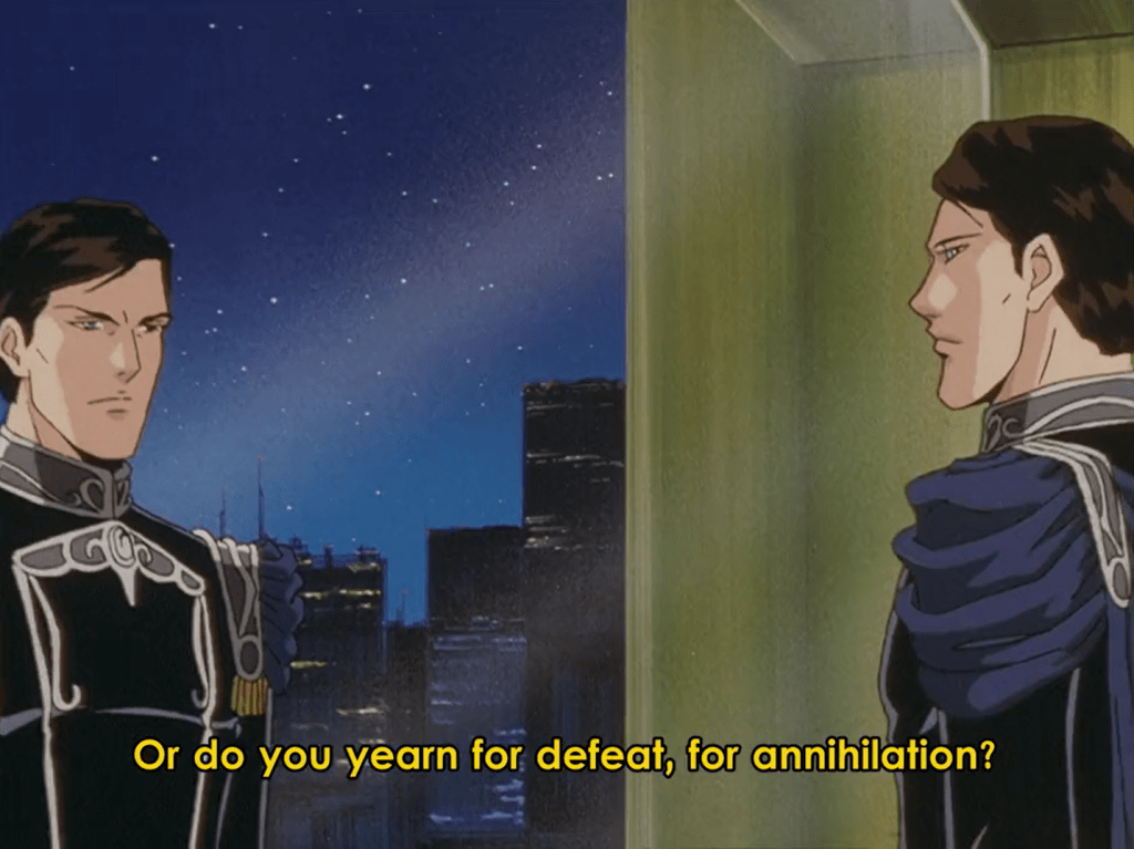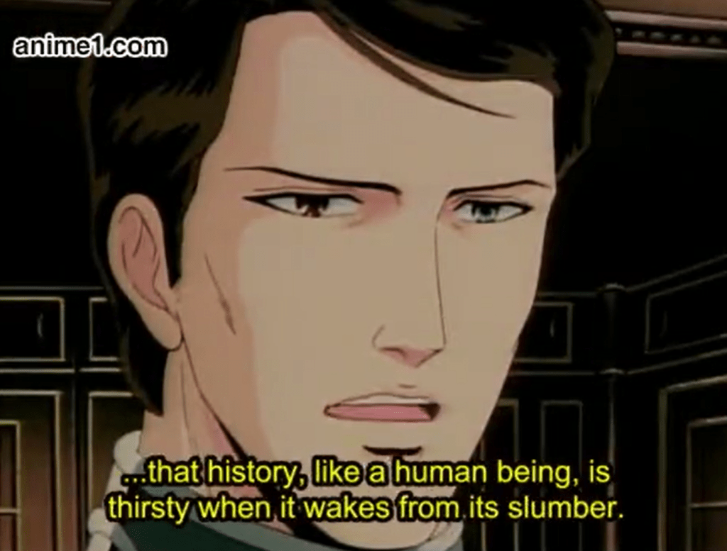 Despite history’s mass scale and its seemingly immutable course being the product of sometimes random events or uncontrollable tides — or inevitable revolutions — LoGH crystallizes such an understanding through the mouths of its characters. Characters such as Yang and Reinhard, and Reuenthal and Hilda and von Schönkopf, and many others, illustrate a satisfying level of understanding and articulation of their own real-time position within the grand drama of history. They necessarily see themselves as subjects to it, this ‘God of History.’ Unrealistically so or not {c’mon it’s anime!}, LoGH’s plots are masterful not necessarily because of the intrigue of the events playing themselves out, but in the detailed nature of how well the characters stake their own role within the canvas, and convey its meaning to the audience. It is a saga, like in Shakespeare, where those with the most power have hearts. And they speak them with passionate abandon, to the Gods, and to us.