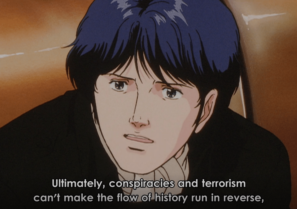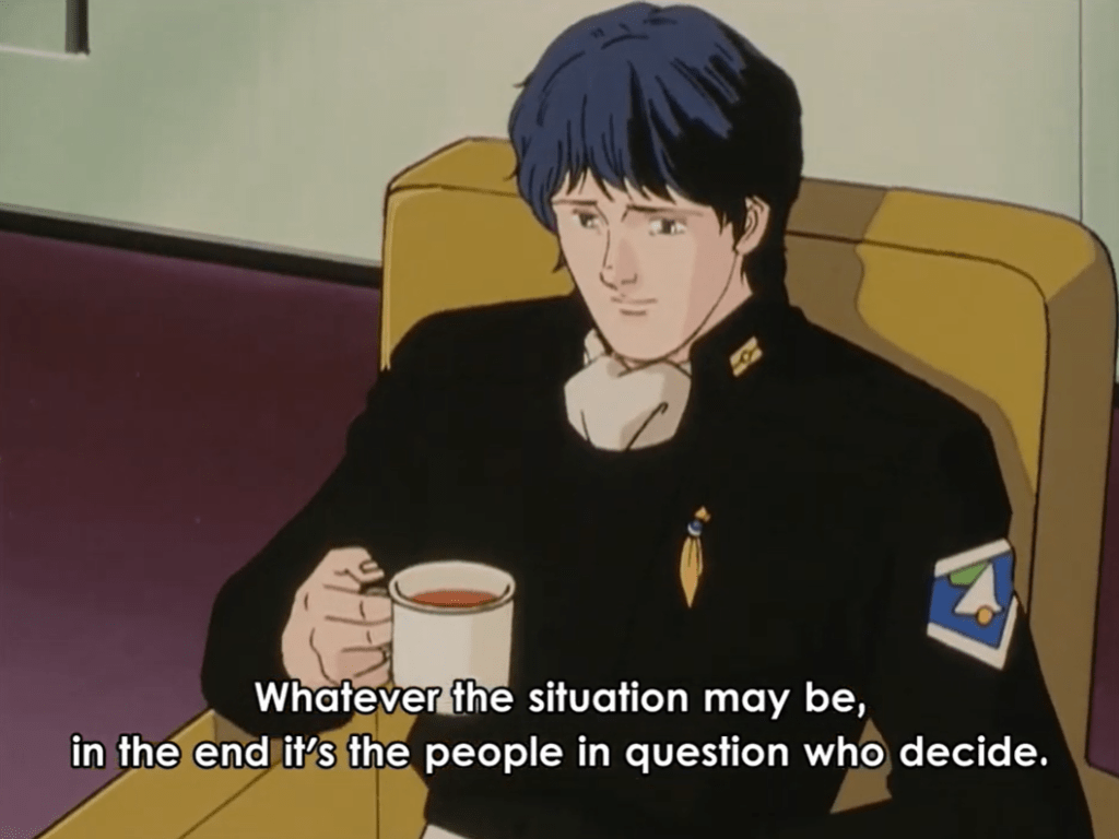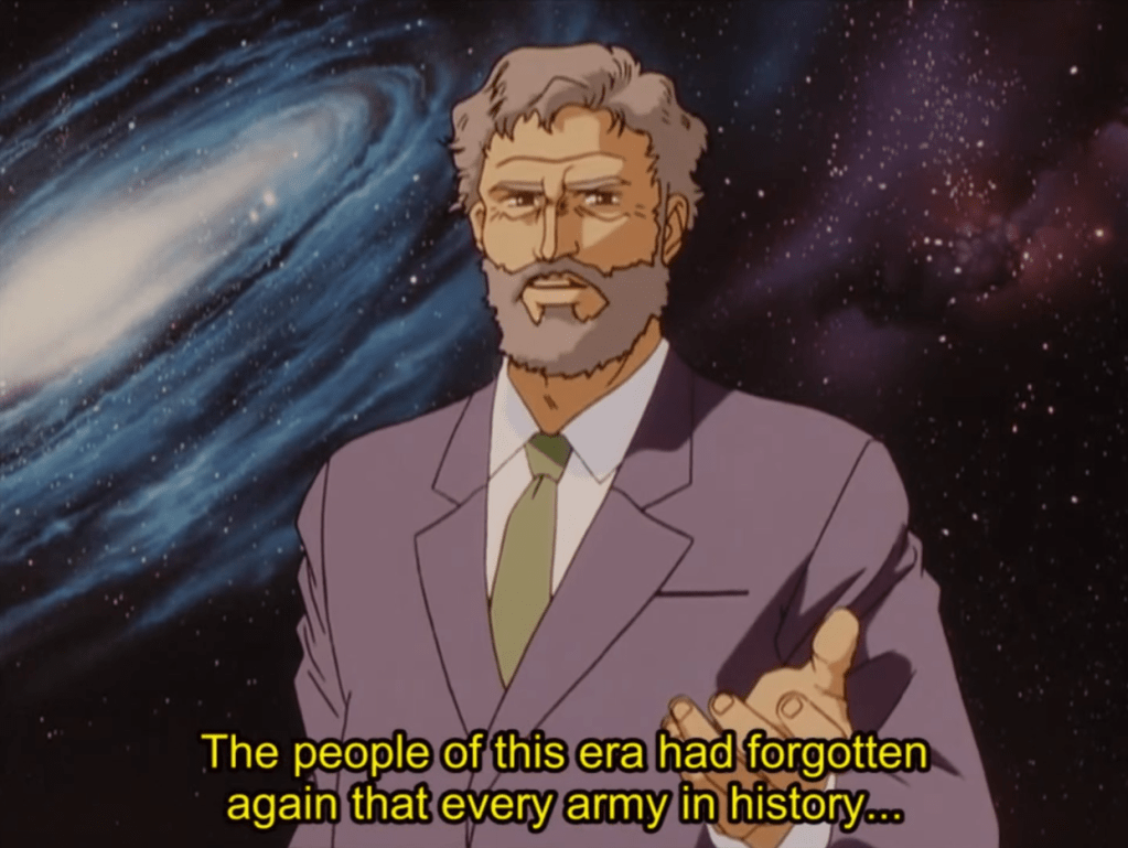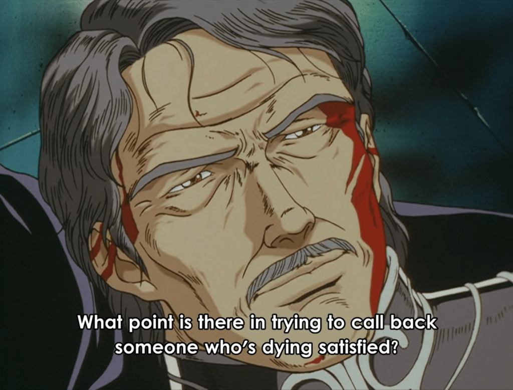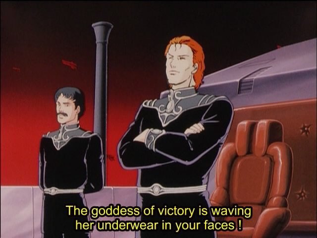 Despite history’s mass scale and its seemingly immutable course being the product of sometimes random events or uncontrollable tides — or inevitable revolutions — LoGH crystallizes such an understanding through the mouths of its characters. Characters such as Yang and Reinhard, and Reuenthal and Hilda and von Schönkopf, and many others, illustrate a satisfying level of understanding and articulation of their own real-time position within the grand drama of history. They necessarily see themselves as subjects to it, this ‘God of History.’ Unrealistically so or not {c’mon it’s anime!}, LoGH’s plots are masterful not necessarily because of the intrigue of the events playing themselves out, but in the detailed nature of how well the characters stake their own role within the canvas, and convey its meaning to the audience. It is a saga, like in Shakespeare, where those with the most power have hearts. And they speak them with passionate abandon, to the Gods, and to us.