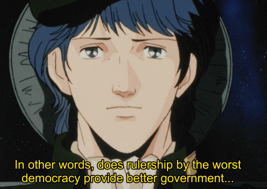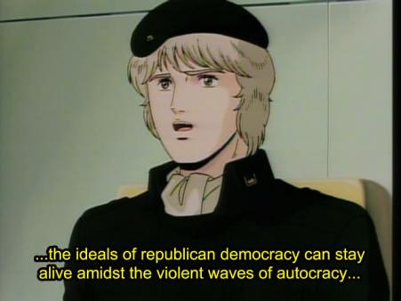 R: Is democracy truly such a wonderful thing? Did the democratic republicanism of the Galactic Federation not end up as the nursery that birthed Rudolf’s Galactic Empire? And the one that sold out the fatherland you love, or so I assume, was the ruler decided by the majority of the citizens of the Alliance. Is democratic republicanism a system of government whose organization and spirit falls by the free will of its people?