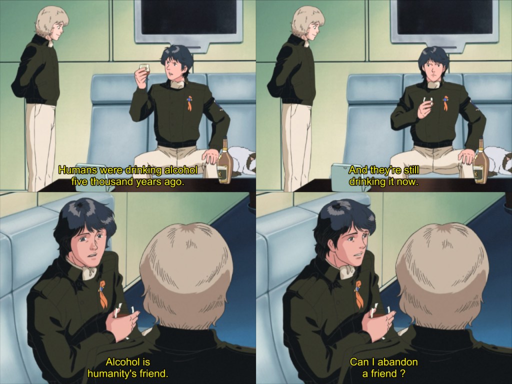 Midway in the story, the pair of top imperial admirals Mittermeyer and Reuenthal — known to the galaxy as the “Twin Jewels of the Empire” — have a calm discussion over drinks. Like all their discussions, it provides some of the best insights into the ongoing conflict and their states of mind in the midst of it as Reinhard’s top commanders.