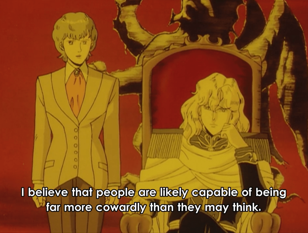 For the republic, even in the face of greed and corruption from elected representatives consistently turning power away from the people and toward a class of elites — Yang remains convicted in his fundamental belief that democracy is the only just way of governance. By remaining true to himself, criticizing such politicians even while fighting back against a military coup he could’ve led, and performing as brilliantly as he does throughout the war against the true imperial threat – by shunning power at every turn – Yang indirectly seizes upon the heart of the people. He is even uncertain that his path is more righteous than Reinhard’s in the end; his commitment to it, to democracy, can be seen as a reflection of his ultimate faith in the people.