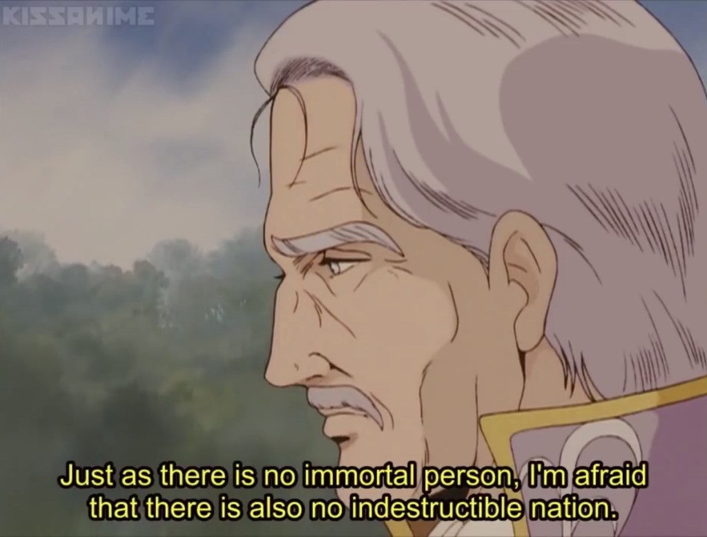 Dynastic, un-meritocratic rulerships have their durations limited by revolutions. Whether they come from deteriorating social and economic conditions, inequality and corruption, or the immortal strive for liberty within a people, every community of Men experiences such political evolution. For the empire, monarchical ‘nobility’ represents an inevitable failure in governance, as the tradition of unearned power leads to hubris and decadence. With his revolution, Reinhard seizes upon such weakness to take power, and then with momentum — and the machinery of the empire — in hand, goes even further in his questing conquest to unify all of space under his rule.