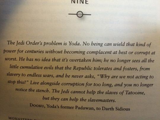 One thesis for why this is — why the Jedi cast their own shadows in the Sith — is not just because human beings {or sentients, in Star Wars alien-inclusive terms} are inherently capable of evil. That may be true, to some degree, for any given person. But I don’t think it entirely explains why so many Jedi fall. No, instead it is because the Jedi Order demands a perfection that cannot be — a highly individualized and *inhumane* perfection within a chaotic and decidedly imperfect galaxy.
