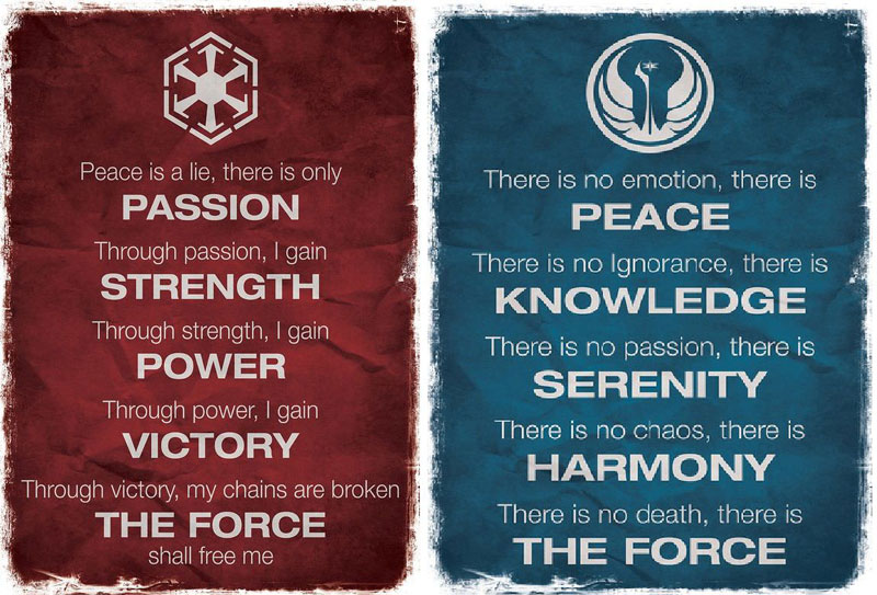 Beyond being extremified, black and white notions of ‘good’ and ‘evil’ for the sake of crafting a mythological space opera with its requisite heroes and villains in constant opposition — what defines the philosophy of the “Light side” and the “Dark side” of this Force?