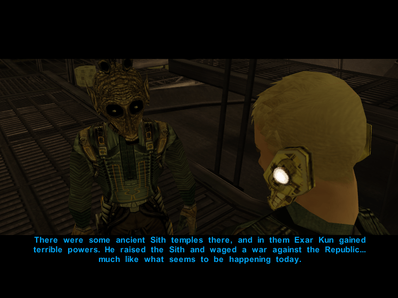The ^ opening crawl ^ of Star Wars: Knights of the Old Republic once more throws us into the midst of a conflict long ago in a galaxy far, far away. Just longer ago. It centers the conflict — like every Star Wars story — on war. The new Dark Lord Malak, apprentice to his late master Darth Revan, wages a war of conquest and domination against the long-standing, now-faltering Republic. A former Jedi, he has fallen to the Dark Side. Cruel and merciless and supremely powerful, Darth Malak threatens to bring the entire known galaxy under his rule. Rising many millennia before Sidious and Vader, these Sith Lords are built differently — they wage their fiery war for control in the sun and not in the shadows, in open and sustained conflict with the Republic, with their sabers drawn and their Force powers flashing.