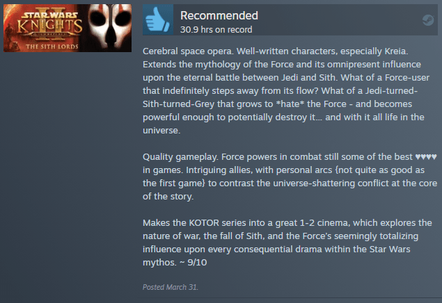 Something that always kinda bugged me about Star Wars was how cartoonishly evil characters like the Emperor were. In the video games, this is also true for many of the “evil” / Dark Side dialogue and action choices. Some turns are needlessly murderous, while others are just mean or spiteful, or even stupid. It is evil-ness to the point of being silly, beyond cunning or for the sake of amplifying power. Even if that is how it plays out for the Emperor and Revan or the Exile, for the sake of the plot, their cruelty often does not seem to have a purpose beyond just establishing the character as cruel. As in, not good. Not a Jedi.