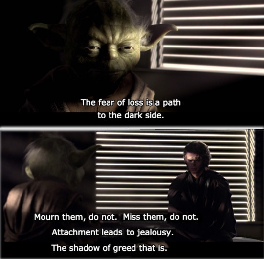 One is selfless, one is selfish — you want to keep them in balance / Falling to dark side entails 1) forgetting about others, 2) harboring desires, 3) fighting to get them — from there, you fear losing what you have gained. Fear leads to Anger leads to Hate leads to Suffering. If you spend all your time being afraid, then you have no compassion for anyone’s pain but your own, you have no time for anyone but yourself. / If you give to others, you don’t think about yourself — then you no longer feel the pain. / “You are allowed to love people. But you are not allowed to possess them.” ~ Anakin’s mistake wasn’t loving, it was not letting go of his love when he knew it was fated to die.