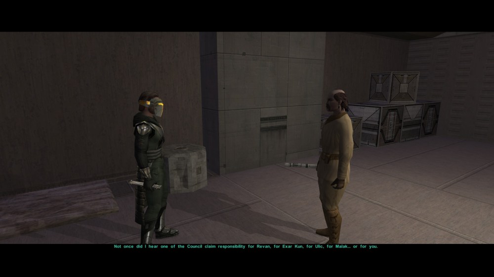 And along their journeys, as the players control them and reconnect them to the Force, Revan and the Exile are able to choose their fate for themselves. You are, regardless of their pasts. As in, through your adventure, you may commit acts of good or evil, angling to gain mastery over the Light OR the Dark side of the Force – or cast yourself somewhere in the middle of them. The choice lay within your hands, within the hands of a conscious mind and free from the Force’s totality. Your companions — including Kreia — are merely reactive to your vanguard, each non-playing characters spitting out predetermined lines and actions in response to your choices.