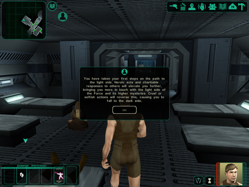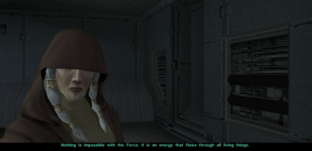 Everyone else in the story — Carth, Bastila, Malak, Kreia, Atton, Nihlus, Sion, Atris, etc. — are all mired within the Force’s will, unable to change their fate. Only Kreia seems aware of this reality, and then, it is only her function to convey it to us, the Exile — the player. Her whole arc is that of guiding the player to an endgame where she can tell us these things, now stronger than her and able to defeat her. In the narrative, she uses the player to achieve her ends / while the game and the creator {The Force} uses her to achieve its storytelling.