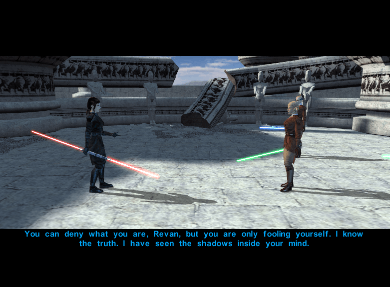 Consider that in both KOTOR games, the player character — Revan and then, the Exile — represents not only a hole in the Force — but in the reality of the game. Meta-wise, the player character is unlike every other character within the game, because you are the only one being controlled by a real person outside of the world of fiction, of the bits and lines of code making up the experience on the screen. You are someone not wholly established within the predetermined potential pathways beforehand, for the choices you are to make are yet to be made. And they are being made in real-time by someone that is conscious, and free to make them.