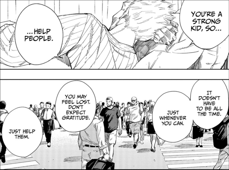These ideals seem to abide by the words of another hero, from another time and space {though very recently allied within my mind here in 2021}. Someone else who inherited his life’s course from the words of an elder. His mother, taking on her heart as Itadori took on his grandfather’s.