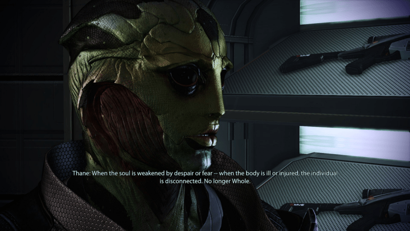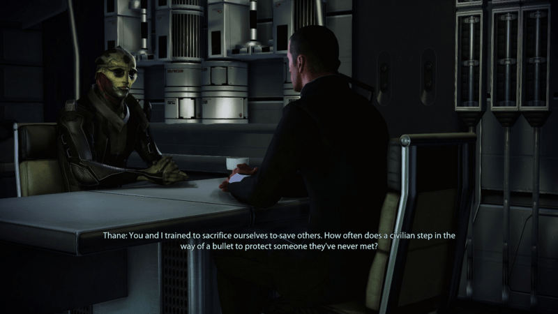 In one such scene, while in conscientious conversation with one of your crewmates, your player character — Commander Shepard — tells Thane Krios, a drell assassin with a photographic memory, who is an extreme loner, the following: