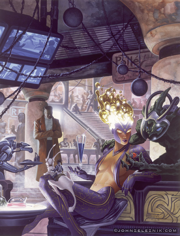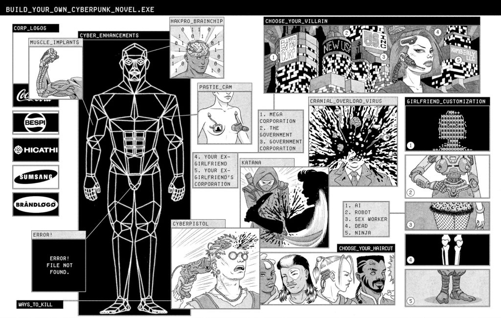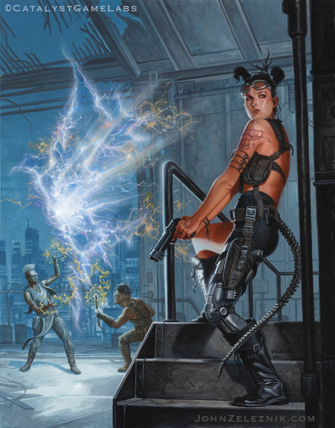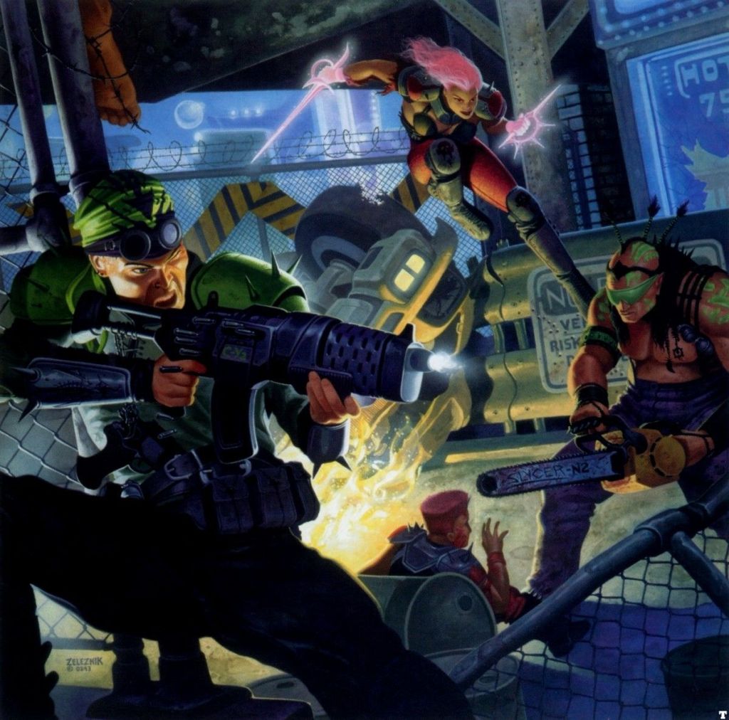 Setting: the pulsing and gleaming neo-cities of the near future, a future of cyberpunkian bacchanalia and desperation, where the underclass makes mercenaries of themselves for street scraps while the ruling class dominates from corpo towers of surveilling, hyper-militarized control… Netrunners surf the cyberscape and try for byzantine scores of digital crypto-wealths, dodging cybercops and Rogue A.I. … Ultra-jacked bagmen for organized crime cooperatives duke it out with robocops blasting to kill… gliding cars overhead, pounding night club beats underneath, skyscrapers that crack a sky of superstorms and acid rain, forgotten underground passages serving as heist entry and exit points, digital highways the color of void, replicant factories and private military x healthcare joint ventures, etc.