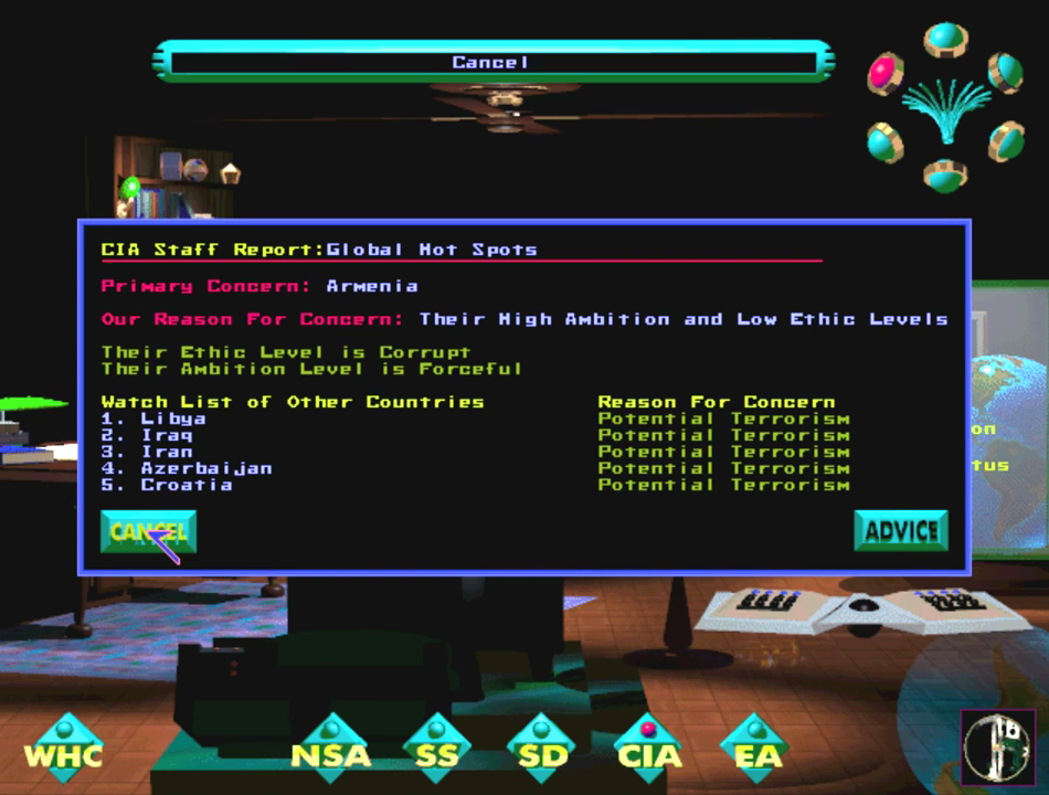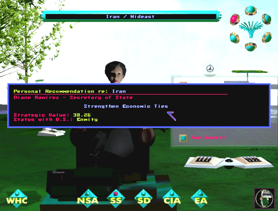 Being popular enough to be re-elected is a vital component of the game, though re-elections can be disabled which in turn greatly reduces the effect of popularity. Managing the budget of the United States, sending aid to foreign countries, dealing with diplomatic crises, and even fighting wars are a largely unavoidable aspect of the game. The player starts the game with seven advisors, which makes the game a bit less confusing. During every American election year, players are not allowed to access their virtual screen starting at midnight on election night so that a panel of bureaucrats can analyze their progress. If their popularity and efficiency is good enough, the player is authorized to use the terminal for four more years. Not getting re-elected automatically means “game over.”