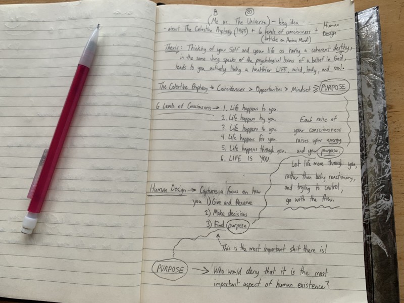 And yet! Altogether, for many different reasons, I am now altered, existentially-speaking, on reasons, causes, purposes, and our “being”ness, and the Universe as perhaps more than something merely logical or overtly absurd. A new thesis — gathered through the above experiences, alongside a few documentaries, my deep-dive, accelerated readings of a mystical novel, an article about the layers of consciousness, and a unifying, new age astrological system, joined with my innate humanistic tendencies — summons itself within me like an ancient daemon roaring out the depths of an interdimensional pocket, beyond this time and space, possessing me with one dose…