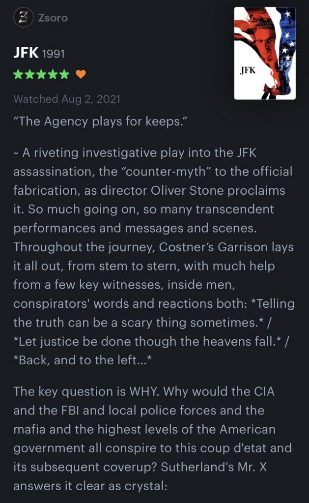 Thusly, I can only concur with Costner’s words from out of a cracking voice directly to the audience at the end of JFK: