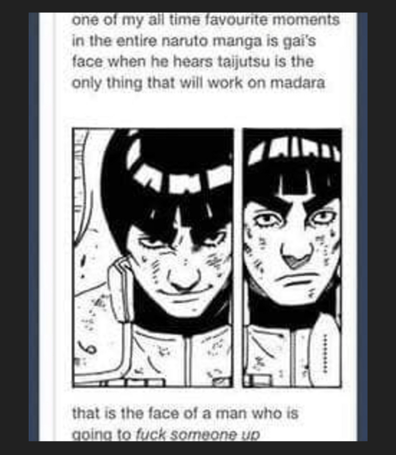 In Naruto, one of the best moments in the series comes when Might Guy opens the “Eighth Gate.” In the struggle against Madara, with the other good guys nearly out of tricks, Guy steps onto the stage once they find out from Minato that the big bad ninja is vulnerable to taijutsu. 体術, literally meaning: Body Techniques, or physical attack — the speciality of Might Guy and his apprentice, Rock Lee.