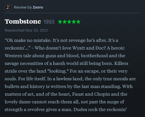Tombstone is a pulpy Western tale. Stupidly Romantic notions of vigilante justice, a side-storied music-swelling romance blooms between the lead mustachio and a traveling bohemian actress-poet, the heat-checking jokester quips from out of the mouth of an erudite gentleman “lunger” who plays Chopin and is utterly undefeated in poker.