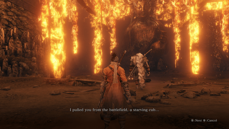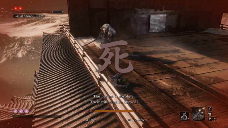 Owl sees Sekiro, his apprentice son, as his weapon, to be used as he sees fit. You are presented with a choice — to go with Owl and betray Lord Kuro, or to defy him for the first time. I chose to disobey my foster father and protect my Lord against his wishes.
