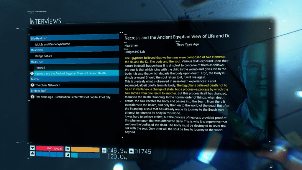 One way Death Stranding explores its themes is through long-form interviews of some of the game’s main characters. Through short memos, you can learn of the Egyptian view of life and death, of Ha and Ka. Or delve the symbolic powers of the mask, art, and even language itself and how they showcase a desperate reaction against mortality. Games like Death Stranding are borne of the need for Mankind to leave a legacy.