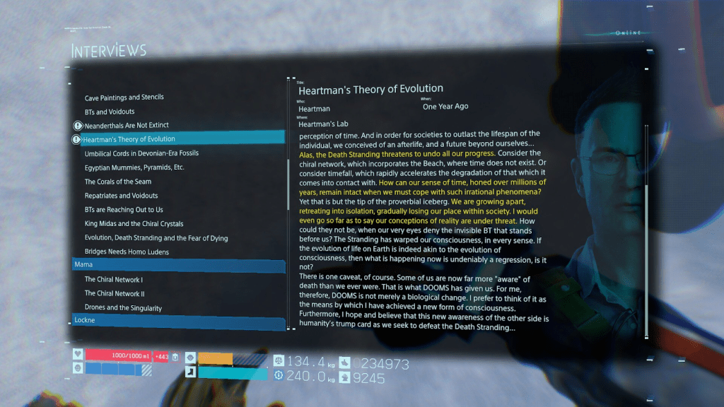Heartman (face of Drive (2011) director Nicolas Winding Refn, voice of Darren Jacobs) believes that the Death Stranding has warped humanity to the point of ending evolution altogether. Through his thought-provoking “Theory of Evolution” interview, the game’s principal smart guy gives you the lowdown on what all this supernatural phenomena may be doing to the progression of consciousness within our species.