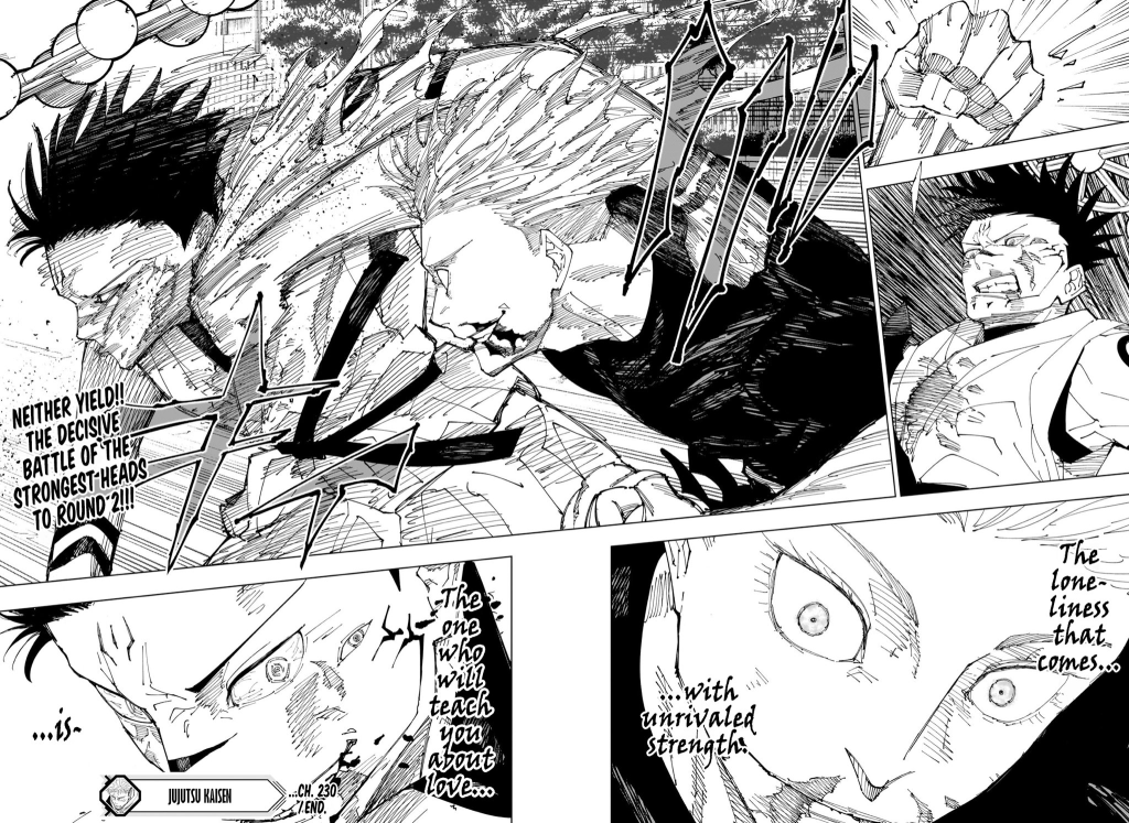 When Gojo and Sukuna face off, you can witness the satisfaction of power’s reciprocation. From Chapter 223-236, the two strongest can finally exert themselves — and thus *know* themselves as if for the first time. In this exchange is a kind of love. It is Gege’s and it becomes the reader’s too. As the two monstrous battle artists get down, one returned from exile and the other now wielding a new student’s body, we bear witness to the joy of a mysterious outcome, a precious novelty for the strongest of the art.