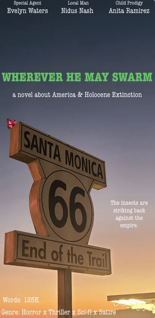 ~ announcing my horror-thriller-sci-fi novel WHEREVER HE MAY SWARM, about a local man gaining control over America’s insects and taking a road trip across Route 66.