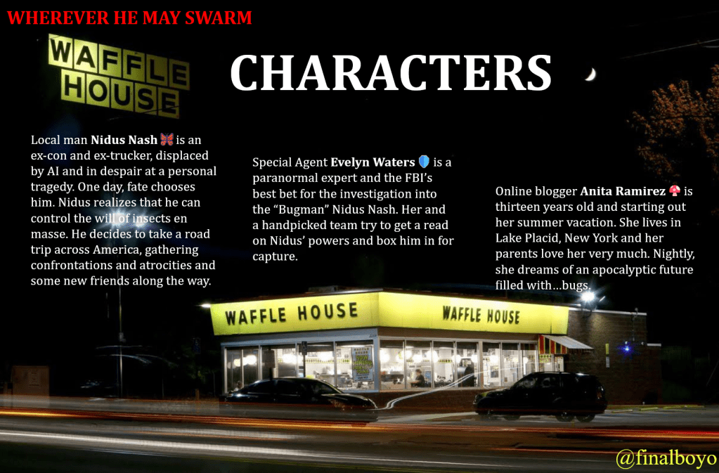 Local man Nidus Nash🦋 is an ex-con and ex-trucker, displaced by AI and in despair at a personal tragedy. One day, fate chooses him. Nidus realizes that he can control the will of insects en masse. He decides to take a road trip across America, gathering confrontations and atrocities and some new friends along the way.