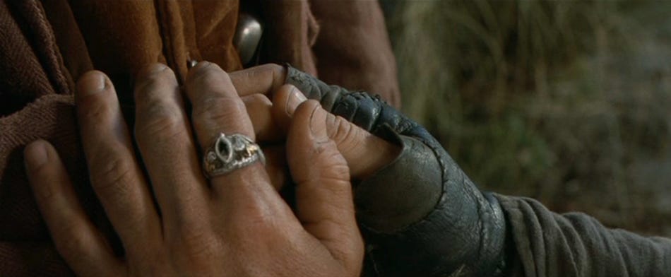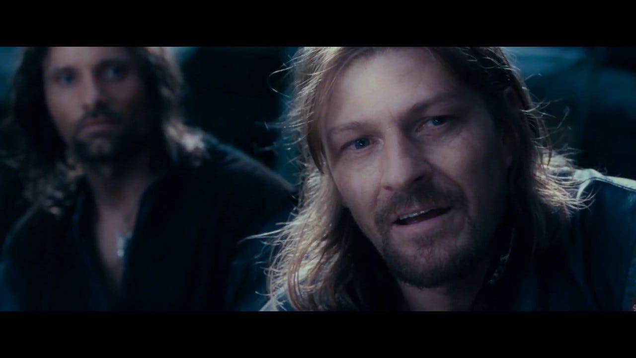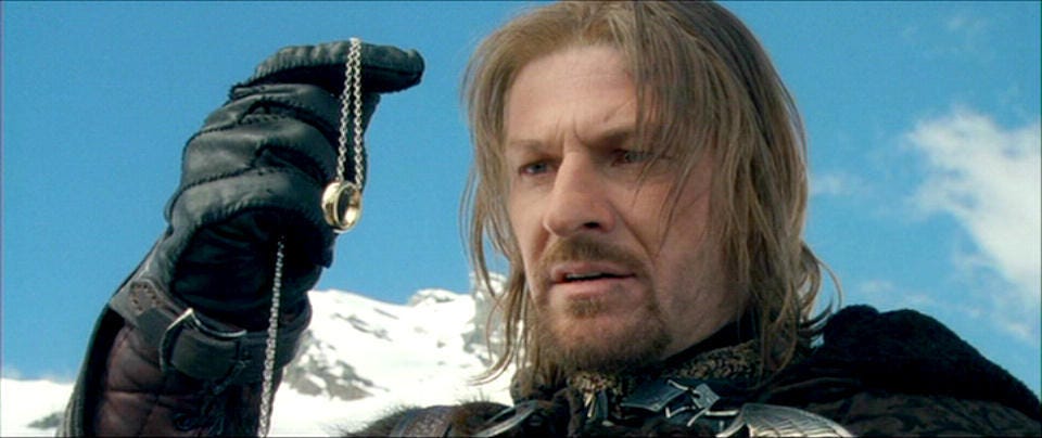 Boromir’s lust for the Ring, for power, enshrouds him as the paragon of Man’s weakness. Before Frodo in the woods, his jabbering utterances and wayward actions symbolize our every complexifying temptation in the presence of naked power. Can we resist it? Can we overcome the will to power? Can we avoid corruption, betrayal, the fall?