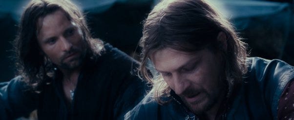 Amidst Tolkien’s tale of struggles for rulership over the land, the relative strength and weakness of Man arises within this pair’s travails. Aragorn and Boromir ~ the dueling dynamic of Manhood in an age of crisis and war. It is their honor and corruptibleness, resilience and redemption, respectively, that drive a prime narrative force in this saga.